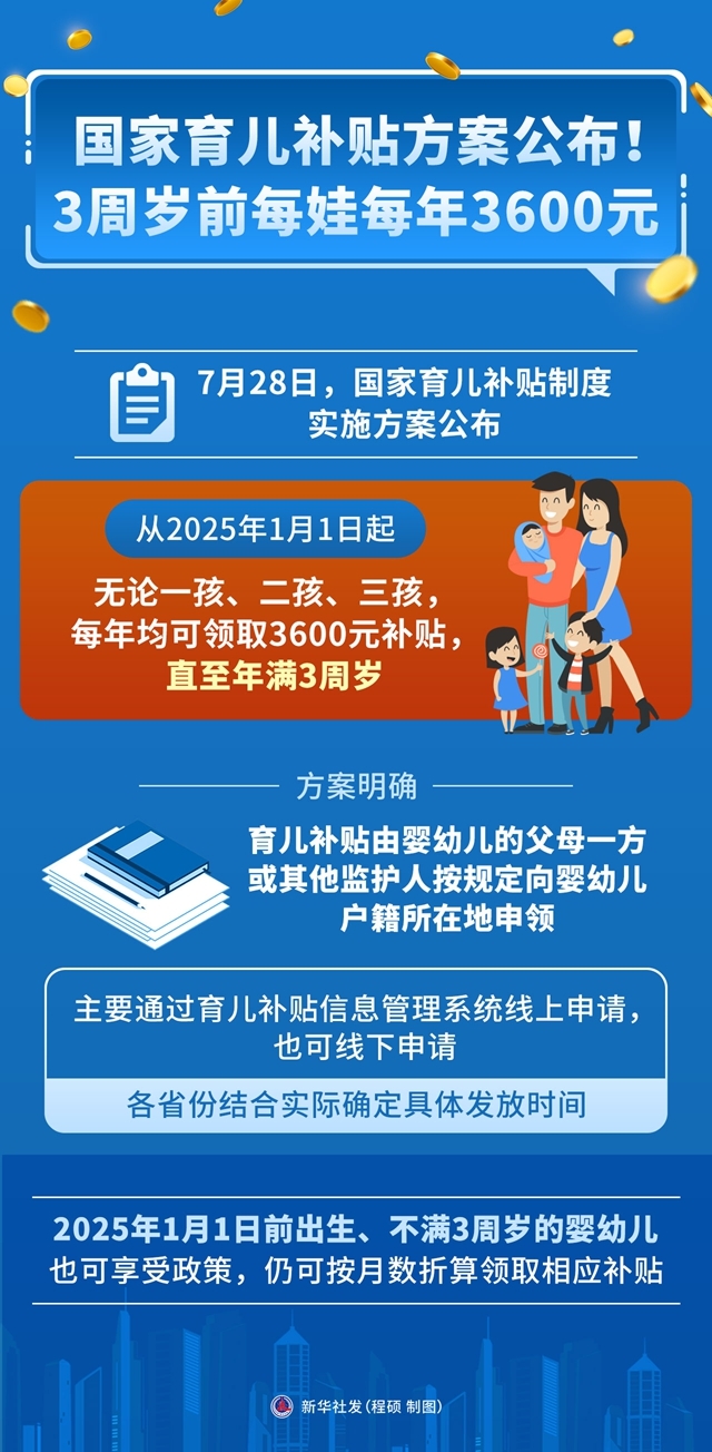 7月28日,國(guó)家育兒補(bǔ)貼制度實(shí)施方案公布,從2025年1月1日起,無(wú)論一孩、二孩、三孩,每年均可領(lǐng)取3600元補(bǔ)貼,直至年滿(mǎn)3周歲。