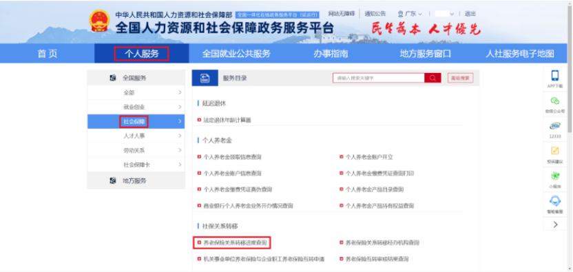 登錄“全國人社政務服務平臺”(https://zwfw.mohrss.gov.cn/)→選擇首頁的“個人服務”模塊→點擊“社會保障”服務→選擇“社保關系轉移”欄目下的“養老保險關系轉移進度查詢”,即可進入查詢頁面。