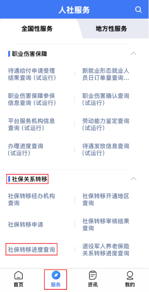 登錄“掌上12333”App→選擇“服務”模塊→點擊“社保關系轉移”欄目中的“社保轉移進度查詢”,即可進入查詢頁面。