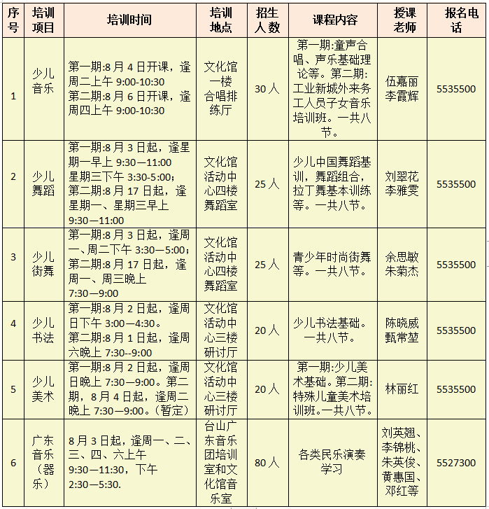臺山市文廣旅體局、文化館一直以來非常重視免費開放藝術培訓工作,經過多年的辛勤耕耘,暑假免費開放少兒藝術培訓班已經成為小朋友由衷喜愛和充滿期待的假期活動項目。他們在這里可以認識很多朋友,有機會和藝術老師面對面交流,還能學到本領幫助自己日后走上藝術道路。無論是群眾性的還是未成年人的組織培訓,臺山文化館都認真做好策劃和服務工作,聘請最有教學經驗的專家老師前來授課,盡力滿足學員們的要求,讓廣大愛好者高興而來、滿意而歸。值得一提的是,今年暑假,總館特別聯合臺山工業新城管委會舉辦一期“外來務工人員子女音樂培訓班”,和有關愛心團體聯合舉辦“特殊兒童美術培訓班”;而今年又是文化館各分館暑假組織免費培訓的第一年,10多個鎮(街、場),幾百鄉鎮少兒愛好者步入藝術學堂,開啟他們快樂而充實的暑假學藝之旅。