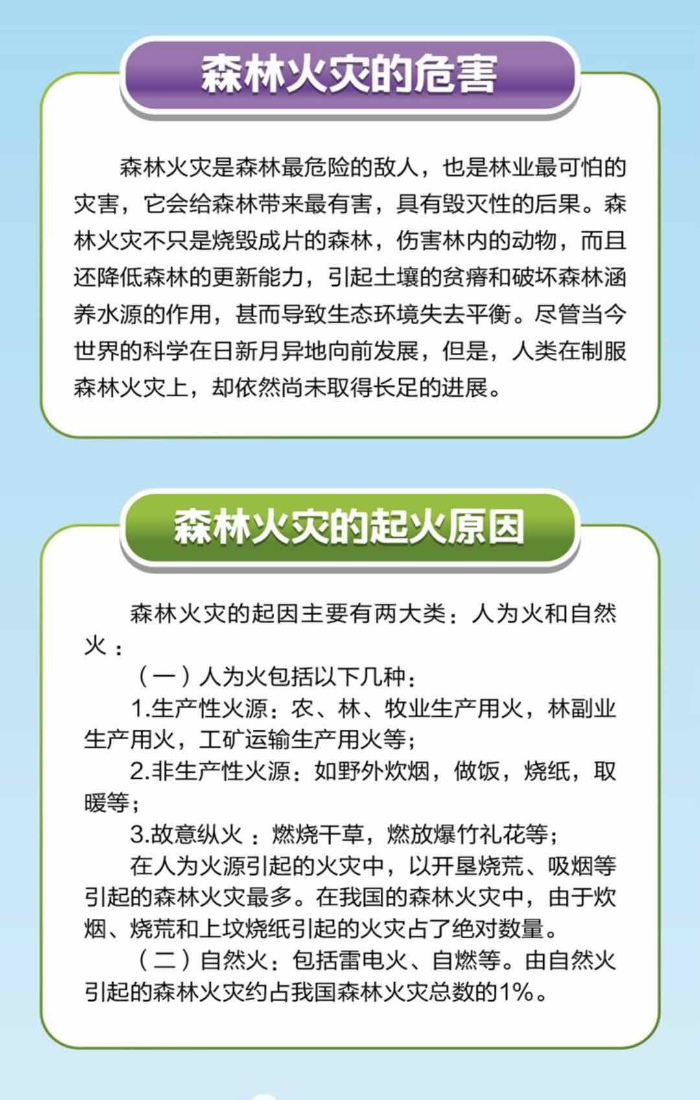 一、請廣大市民謹記森林防火區和森林特別防護期。森林防火區為我市行政區域內的林地及距離林地邊緣30米范圍;森林特別防護期為每年10月1日至次年4月30日。在森林防火區和森林特別防護期內,未經批準,禁止一切野外用火。