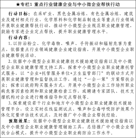 (一)深化職業病危害預防治理。在產業轉型升級、標準規范制定、技術升級改造和中小微企業幫扶方面統籌考慮職業健康工作。組織對“十三五”時期新報告職業病用人單位、重點行業企業開展重點治理。強化用人單位主體責任,依法落實職業病危害項目申報、建設項目職業病防護設施“三同時”、職業病危害因素檢測評價、勞動者職業健康檢查和健康培訓等制度。在有條件的地區推動用人單位開展重點職業病危害因素在線日常監測試點。以粉塵、化學毒物、噪聲和輻射等職業病危害嚴重的行業領域為重點,持續開展職業病危害因素監測和專項治理。建立中小微企業職業健康幫扶機制。實施重點行業領域聽力保護行動,從噪聲危害監測、健康教育培訓、聽力保護指導及效果評估、早期健康篩查、臨床診斷治療等關鍵點預防和控制噪聲危害。加強職業活動中新發現危害的辨識評估和防控,開展肌肉骨骼疾患和職業緊張等防治行動。職業病防治技術支撐機構要積極協助和技術指導住房城鄉建設、交通、司法等部門加強環衛工人、“兩客一危”從業人員以及從事勞動改造服刑人員等重點領域或特殊機構相關人員的職業健康保護。充分發揮產業、職業健康等行業協會作用,強化行業自律,規范行業職業健康工作。