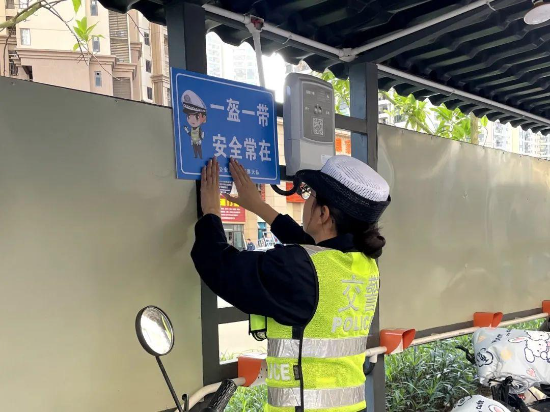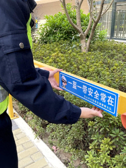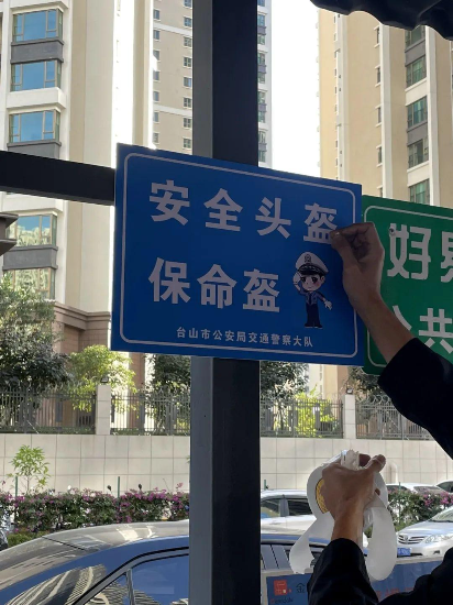 臺山交警在臺城城區多個電動自行車充電棚懸掛摩電交通安全宣傳標語牌,提醒大家在出行時牢記交通安全,潛移默化中提高電動自行車駕駛人的交通安全意識和守法意識。