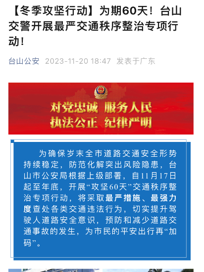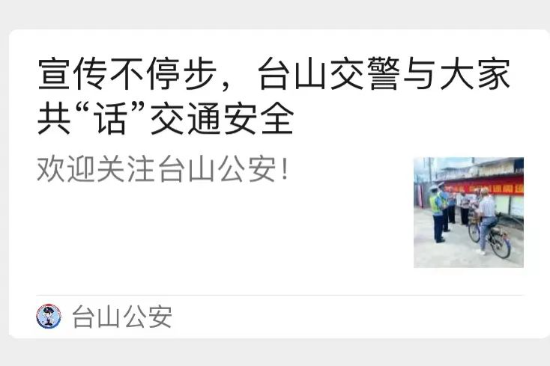 臺山交警通過“臺山公安”微信平臺,持續發布違法案例曝光、開展秩序整治工作、開展宣傳工作及交通安全提示等推文及視頻,提醒廣大交通參與者要嚴格遵守道路交通安全法律法規,始終緊繃交通安全這根弦。