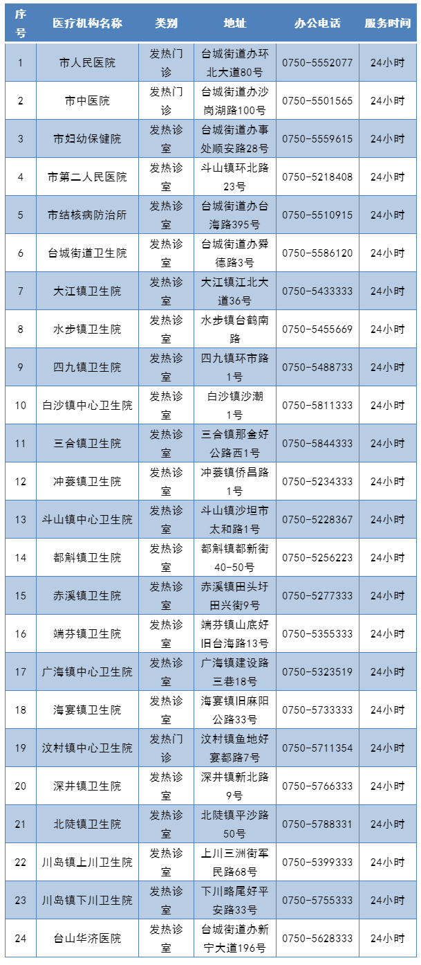 臺山市發熱門診(診室)一覽表