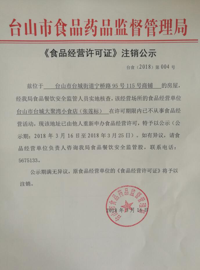 臺山市臺城大聚灣小食店 《食品經營許可證》注銷公示