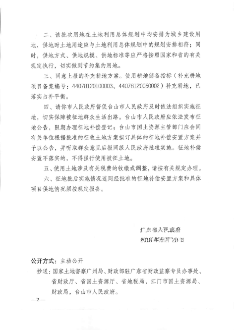 廣東省人民政府關于臺山市2017年度第九批次城鎮建設用地的批復