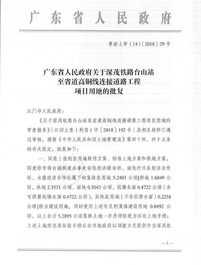 廣東省人民政府關于深茂鐵路臺山站至省道高銅線連接道路工程項目用地的批復