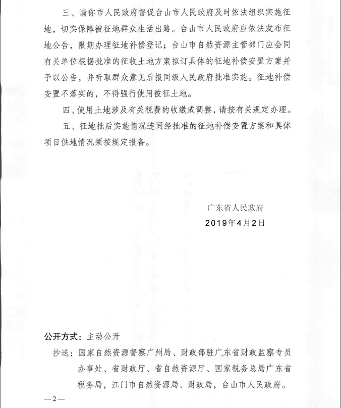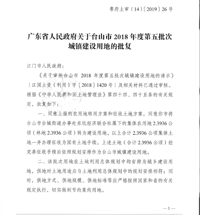 廣東省人民政府關于臺山市2018年度第五批次城鎮建設用地的批復