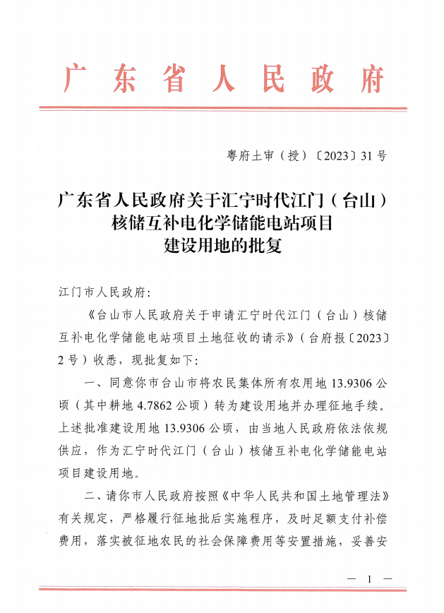 廣東省人民政府關于匯寧時代江門(臺山)核儲互補電化學儲能電站項目建設用地的批復—粵府土審(授)〔2023〕31號