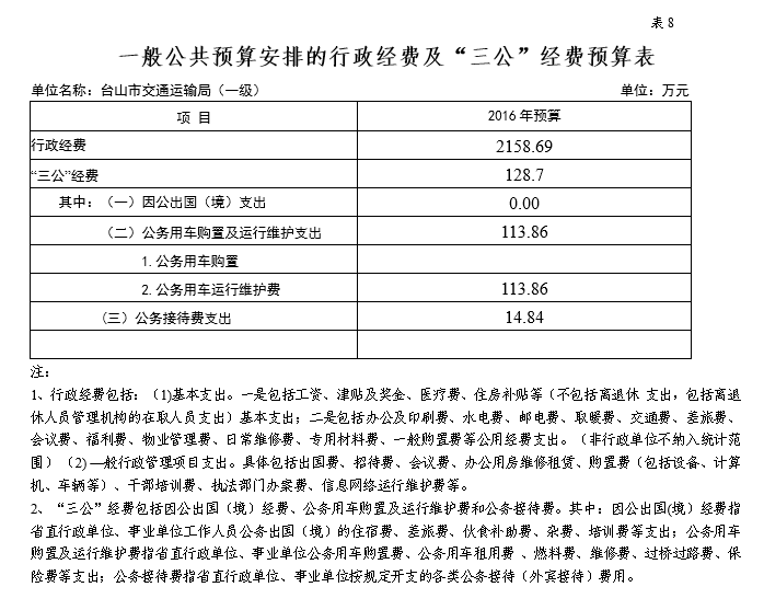(一)本部門預算為匯總預算,包括:局本級預算,以及納入編制范圍的下屬事業單位預算。下屬事業單位具體包括:臺山市交通管理總站、臺山市地方公路管理站。