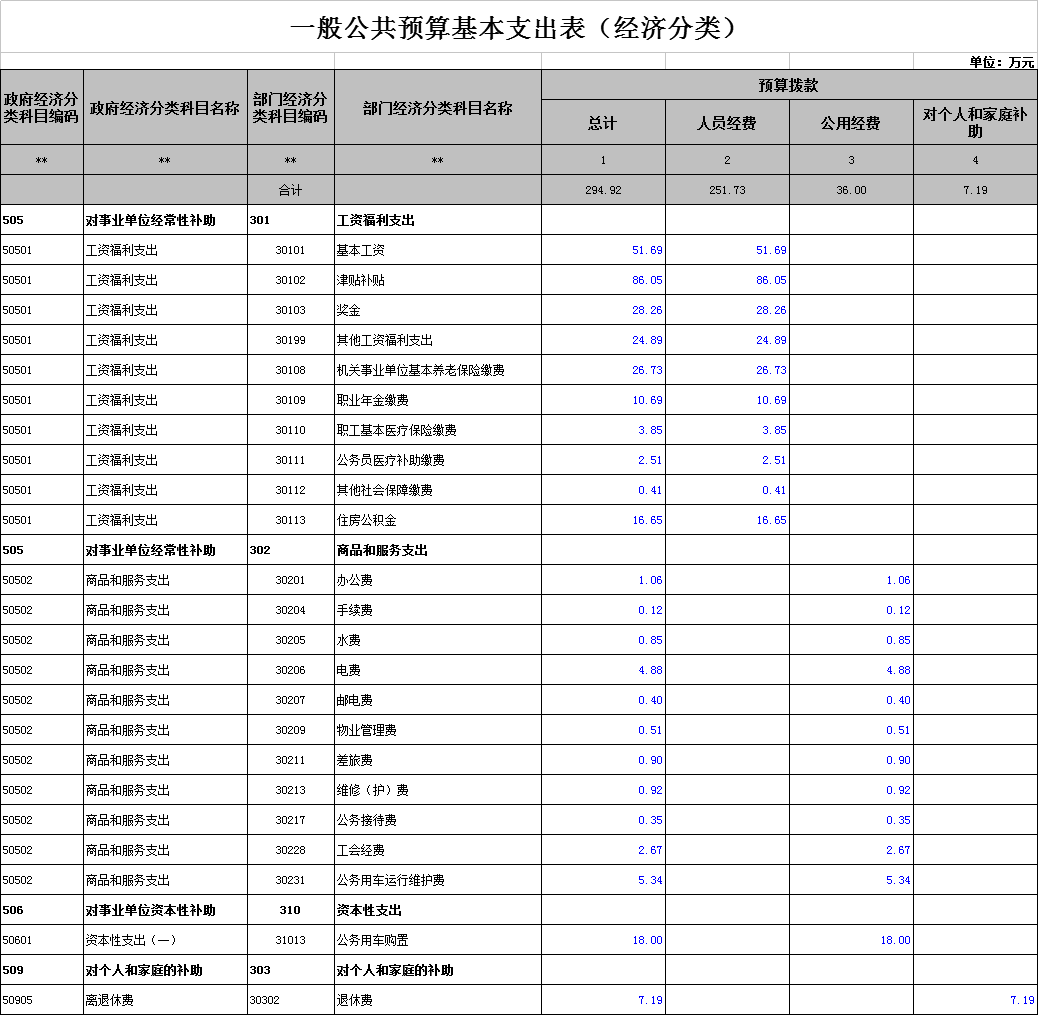 基本支出(含工資福利性支出、對(duì)個(gè)人和家庭補(bǔ)助支出和公用支出)294.92萬(wàn)元。
