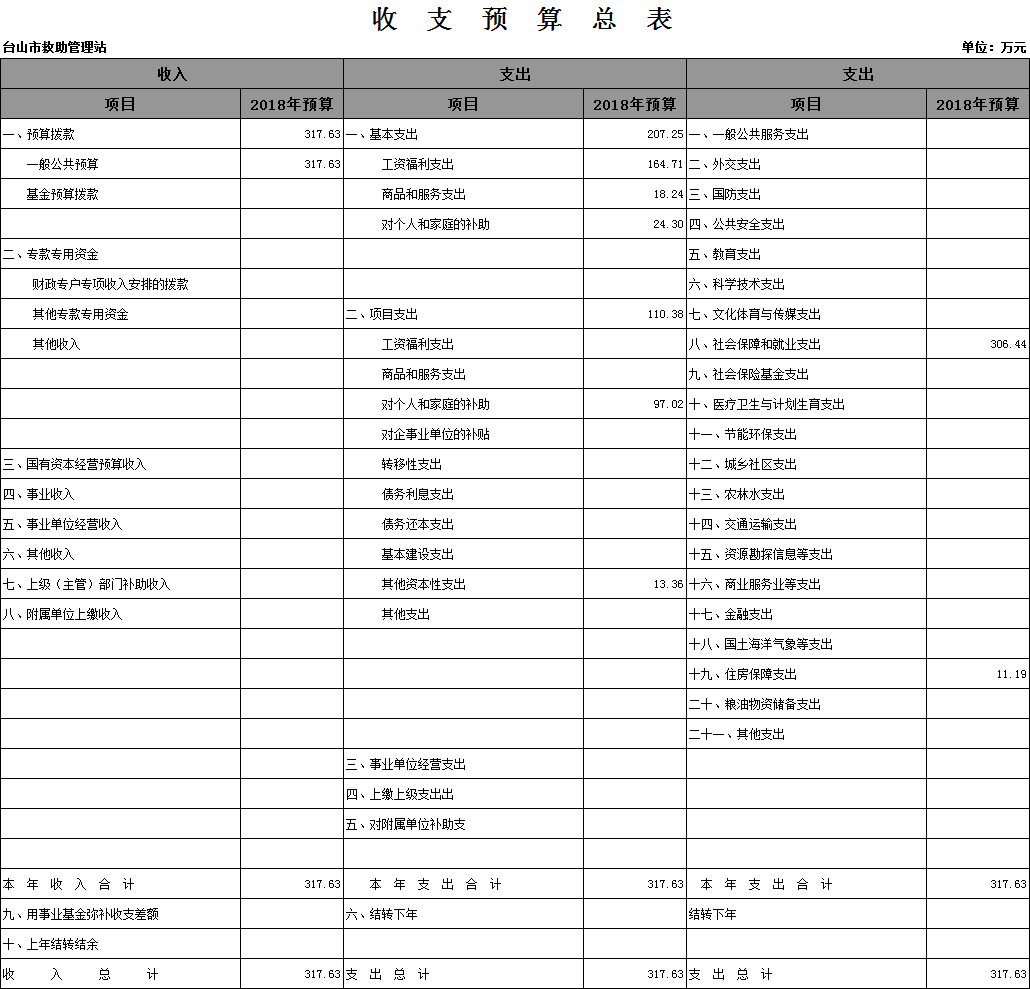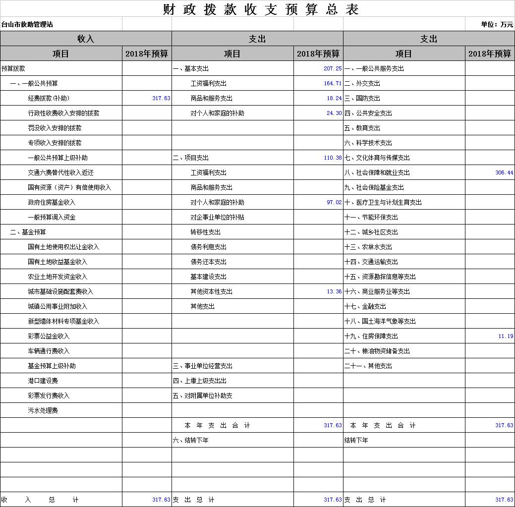 2018年公共財(cái)政預(yù)算一般公共預(yù)算和基金預(yù)算撥款安排的支出共317.63萬元。其中: