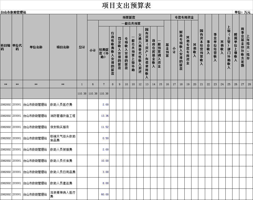 項(xiàng)目支出預(yù)算110.38萬元,主要支出項(xiàng)目有:流浪乞討人員救助支出110.38萬元。