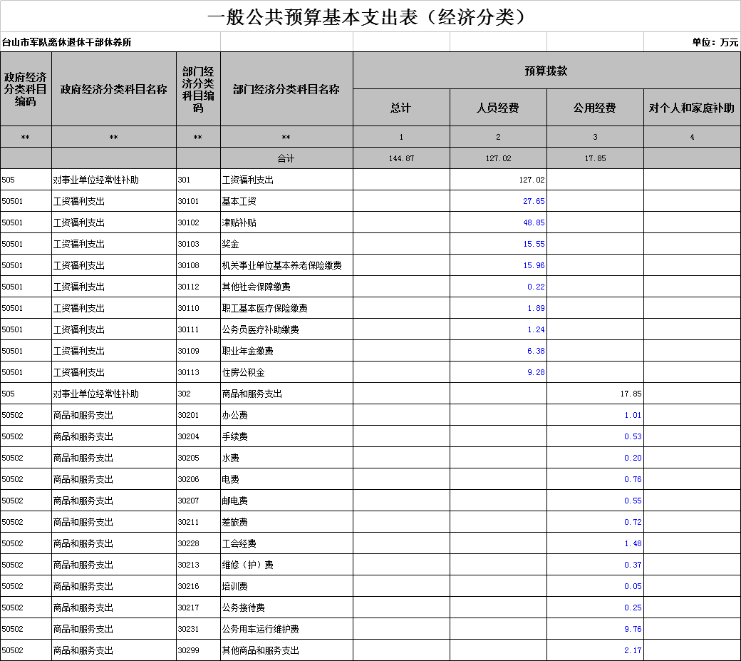 基本支出(含工資福利性支出、對個人和家庭補助支出和公用支出)144.87萬元。