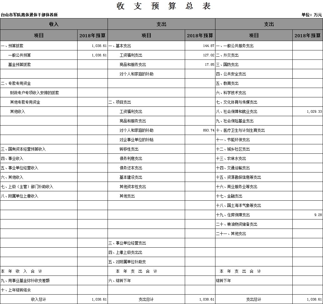 2018年一般公共預算和基金預算撥款安排的支出共1038.61萬元。其中: