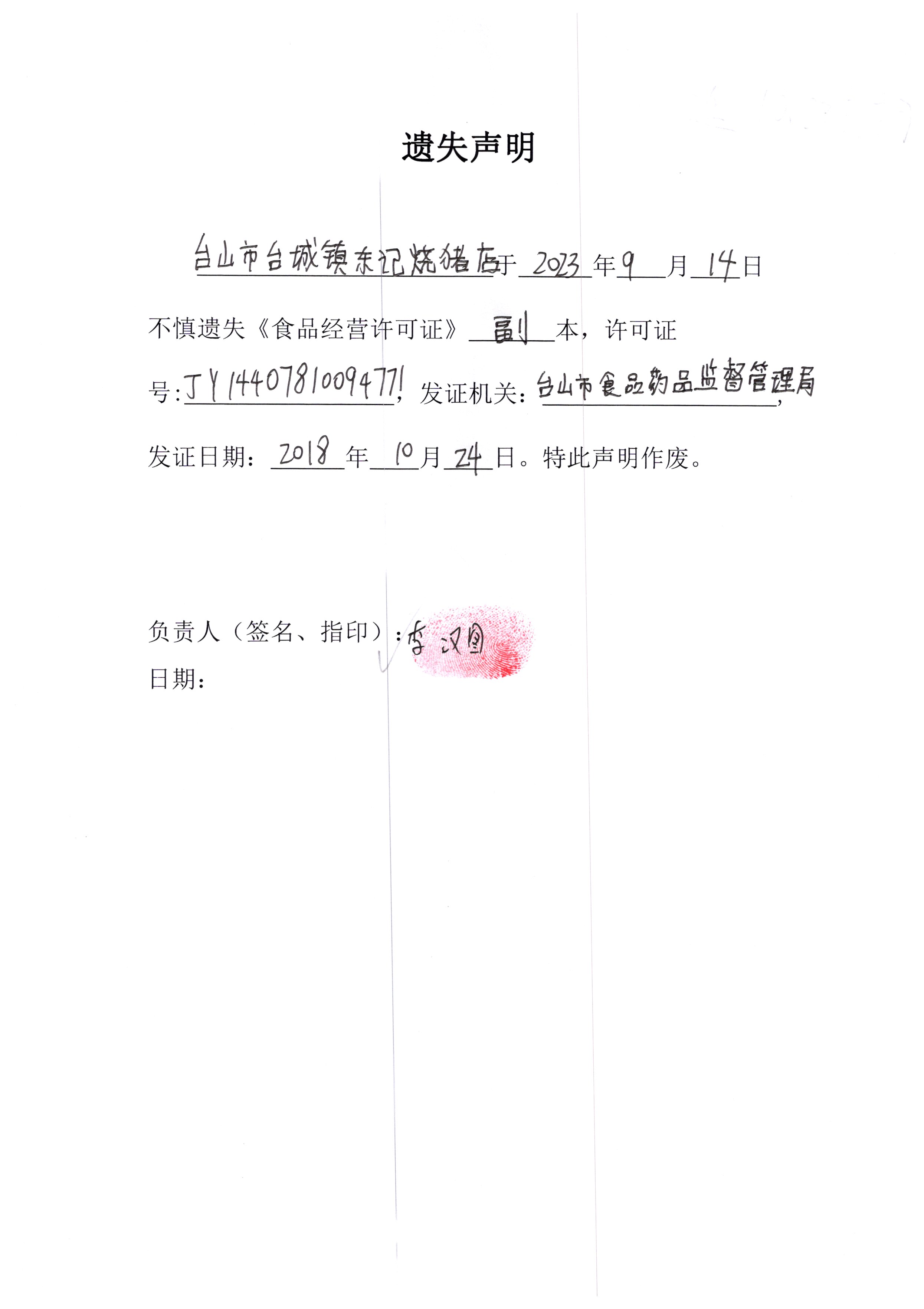 遺失聲明——臺(tái)山市臺(tái)城鎮(zhèn)東記燒豬店