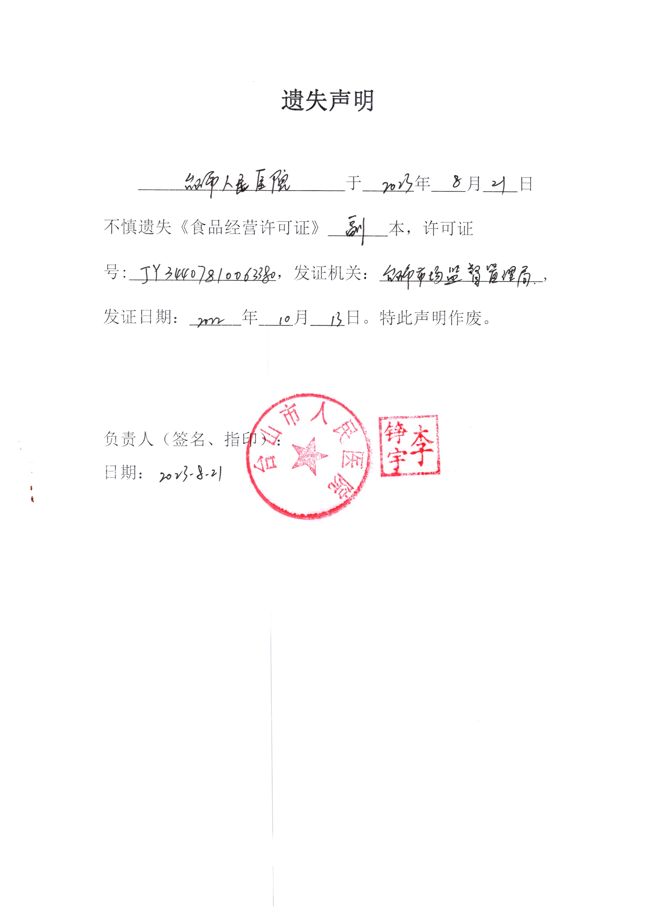 遺失聲明——臺山市人民醫院,臺山市人民醫院(石花分院)