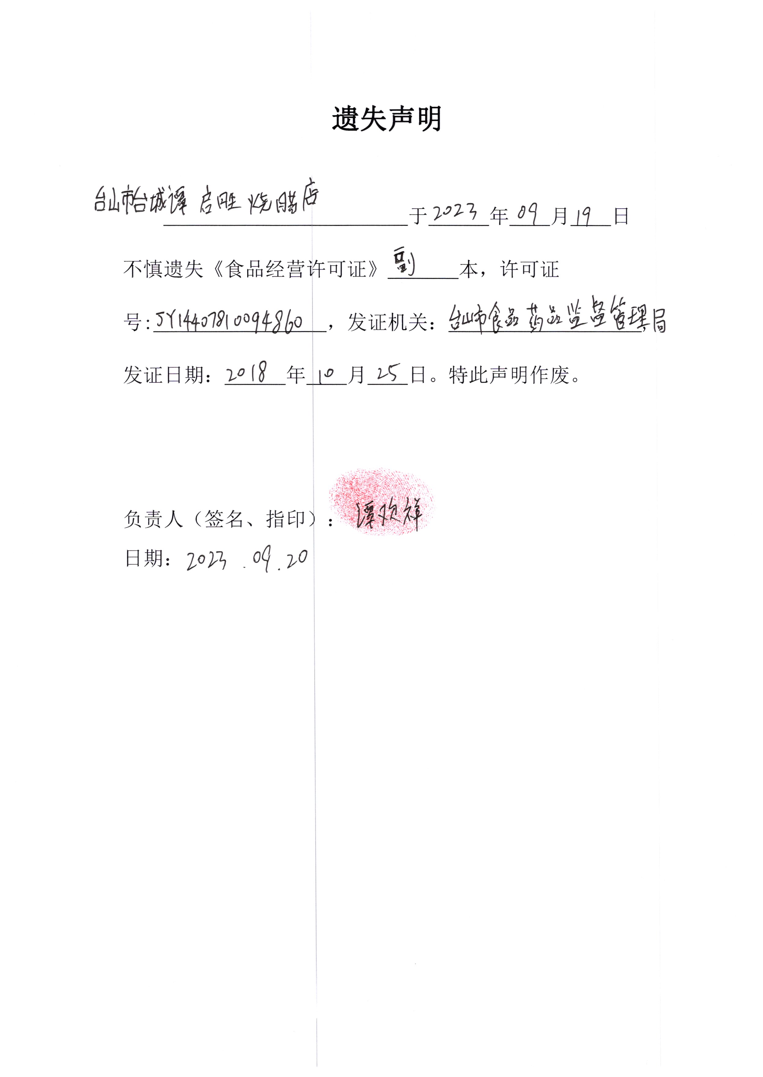遺失聲明——臺山市臺城譚啟勝燒臘店