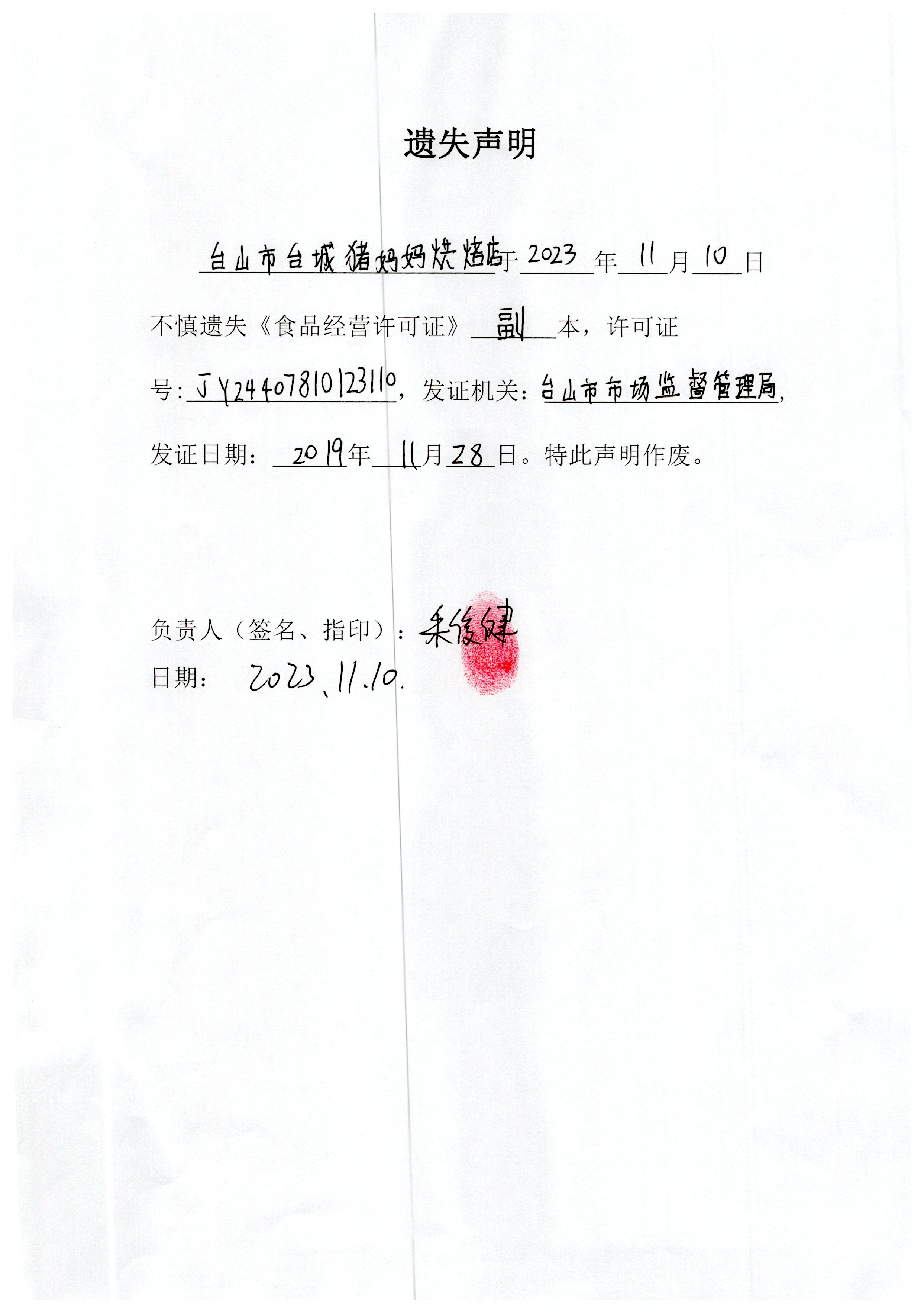 遺失聲明——臺山市臺城豬媽媽烘焙店