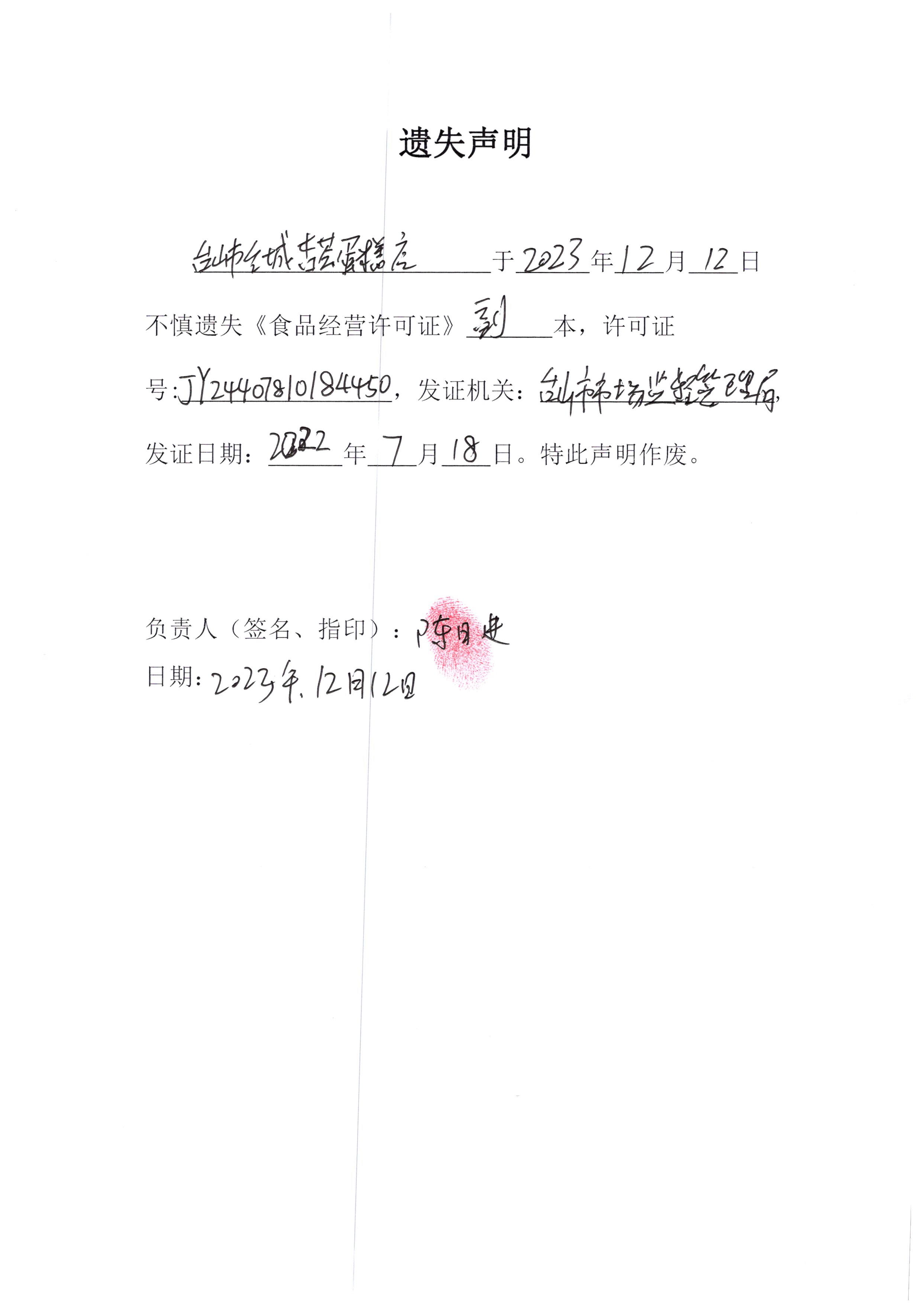 遺失聲明——臺山市臺城杏薈蛋糕店