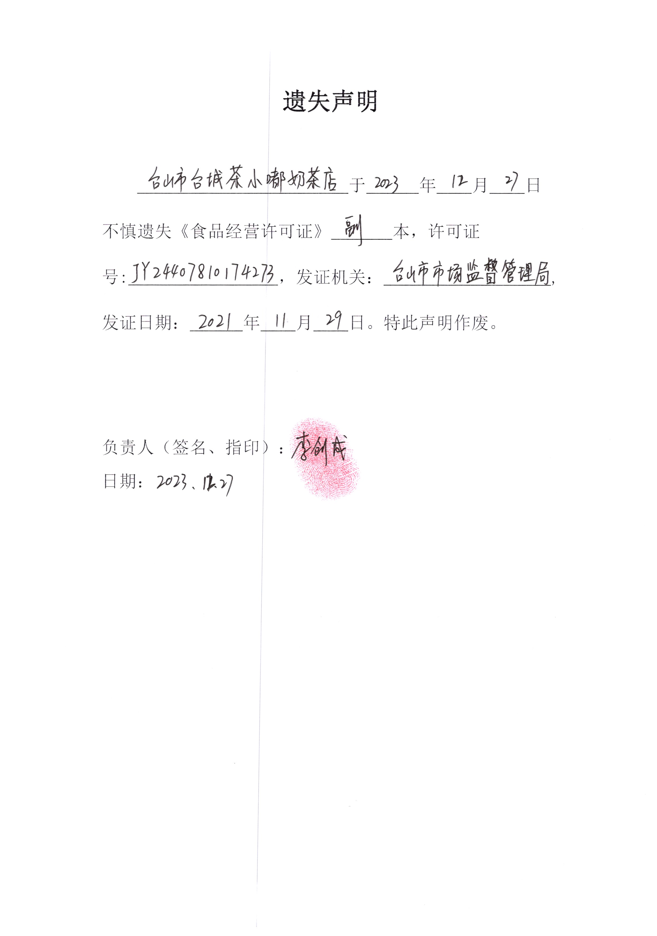 遺失聲明——臺山市臺城茶小嘟奶茶店