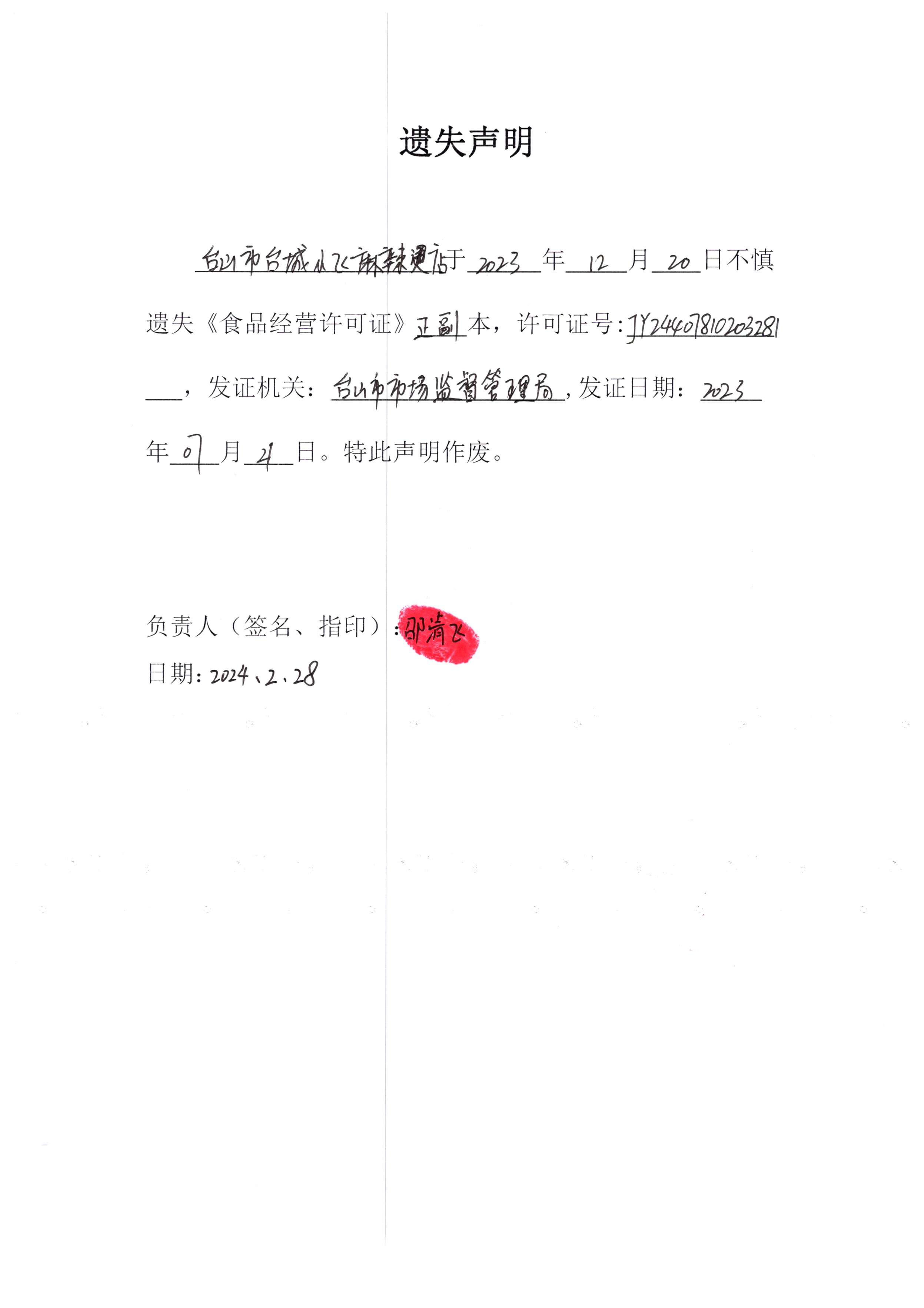 遺失聲明——臺山市臺城小飛麻辣燙店