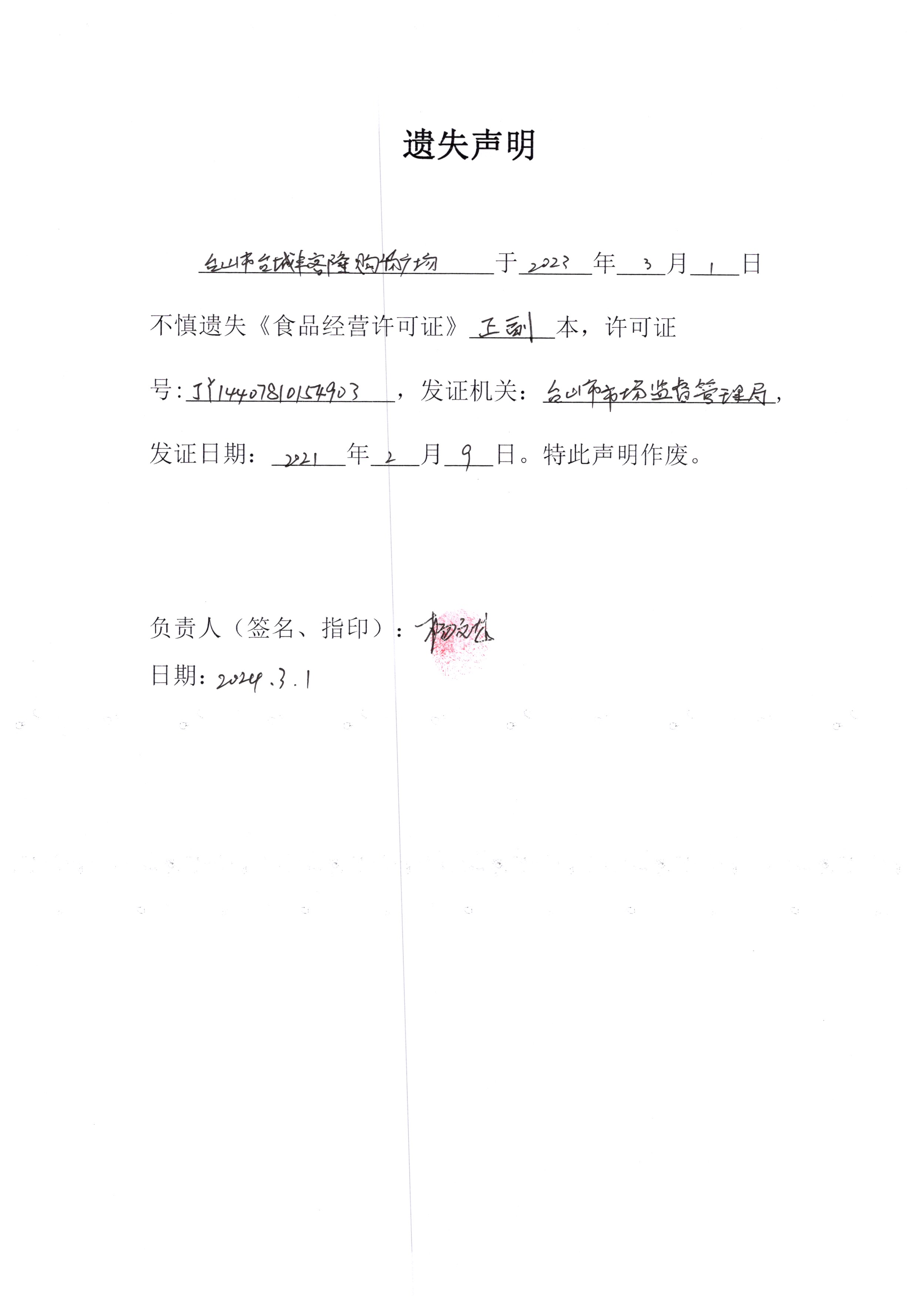 遺失聲明——臺山市臺城豐客隆購物廣場
