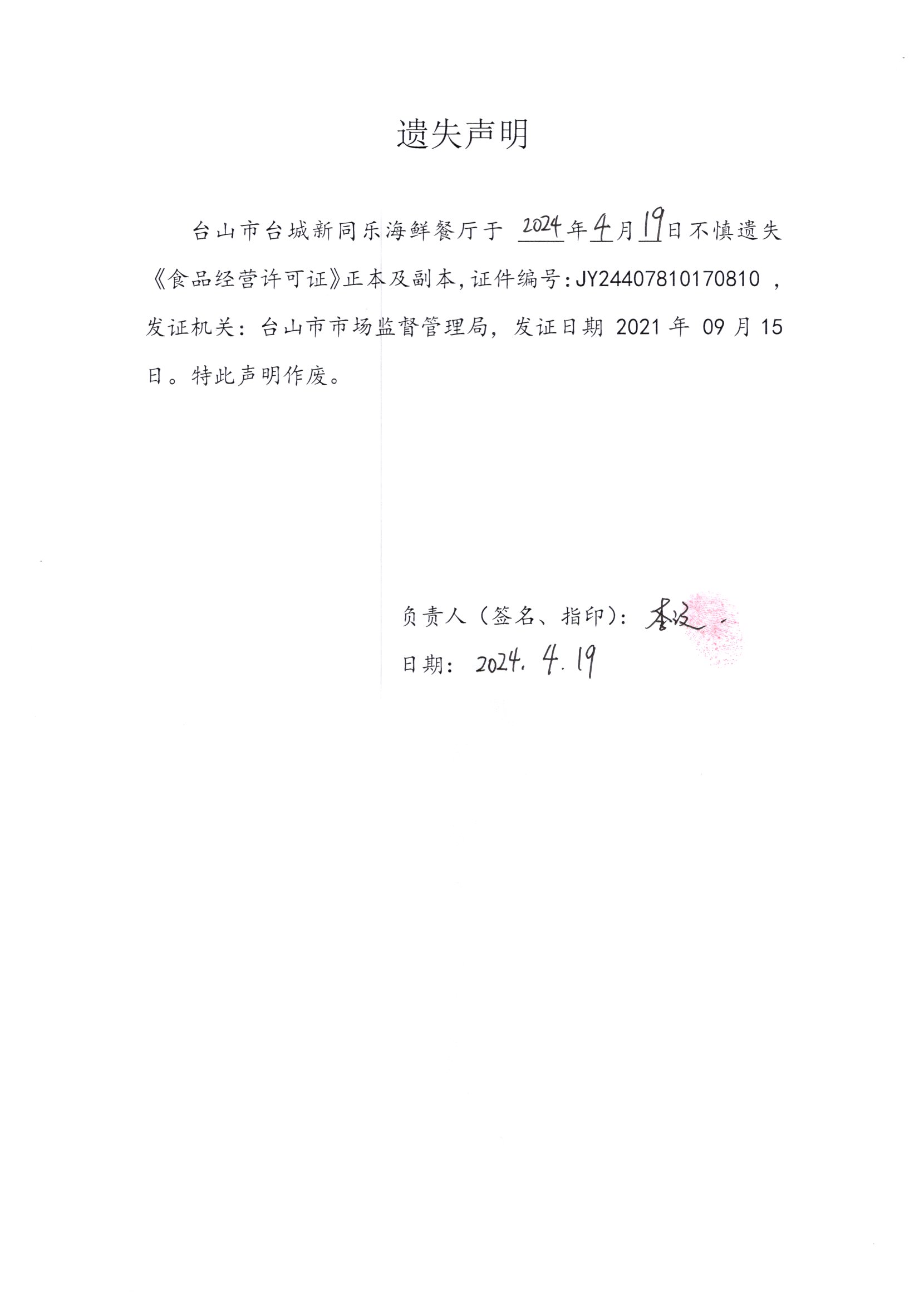 遺失聲明——臺山市臺城新同樂海鮮餐廳