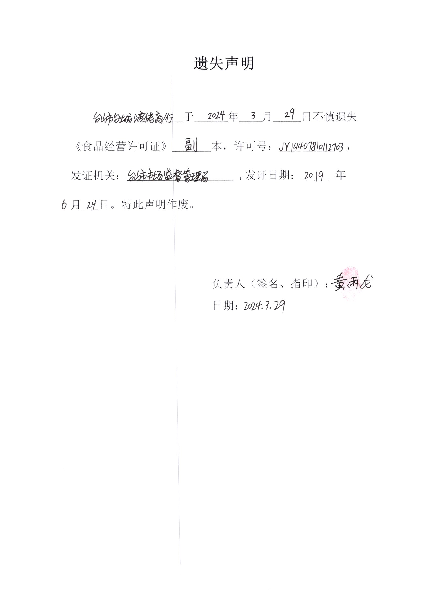 遺失聲明——臺山市臺城渡佬商行