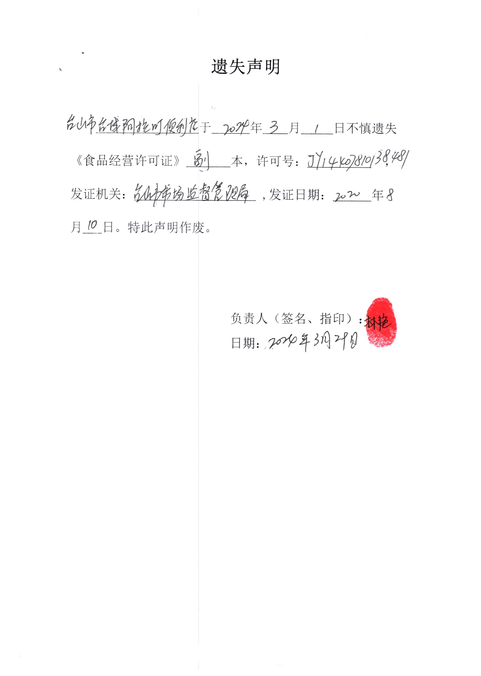 遺失聲明——臺(tái)山市臺(tái)城阿拉叮便利店