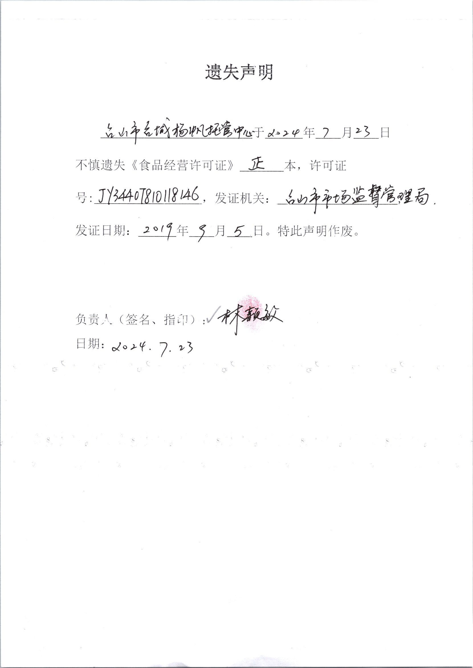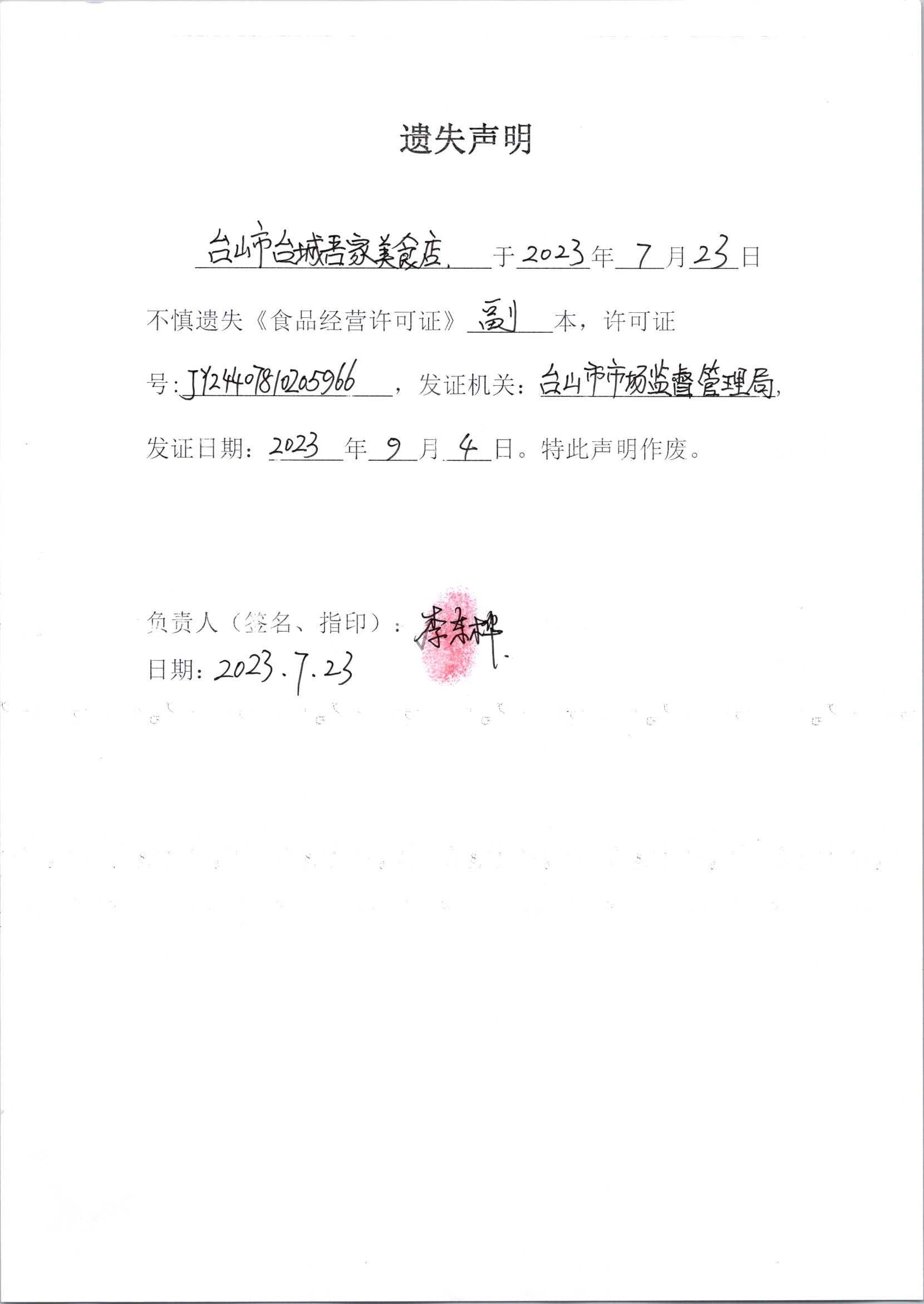 遺失聲明--臺山市臺城吾家美食店、臺山市臺城鑫月便利店、臺山市臺城序緣飲食店、臺山市臺城言杰快餐店、臺山市臺城楊帆托管中心