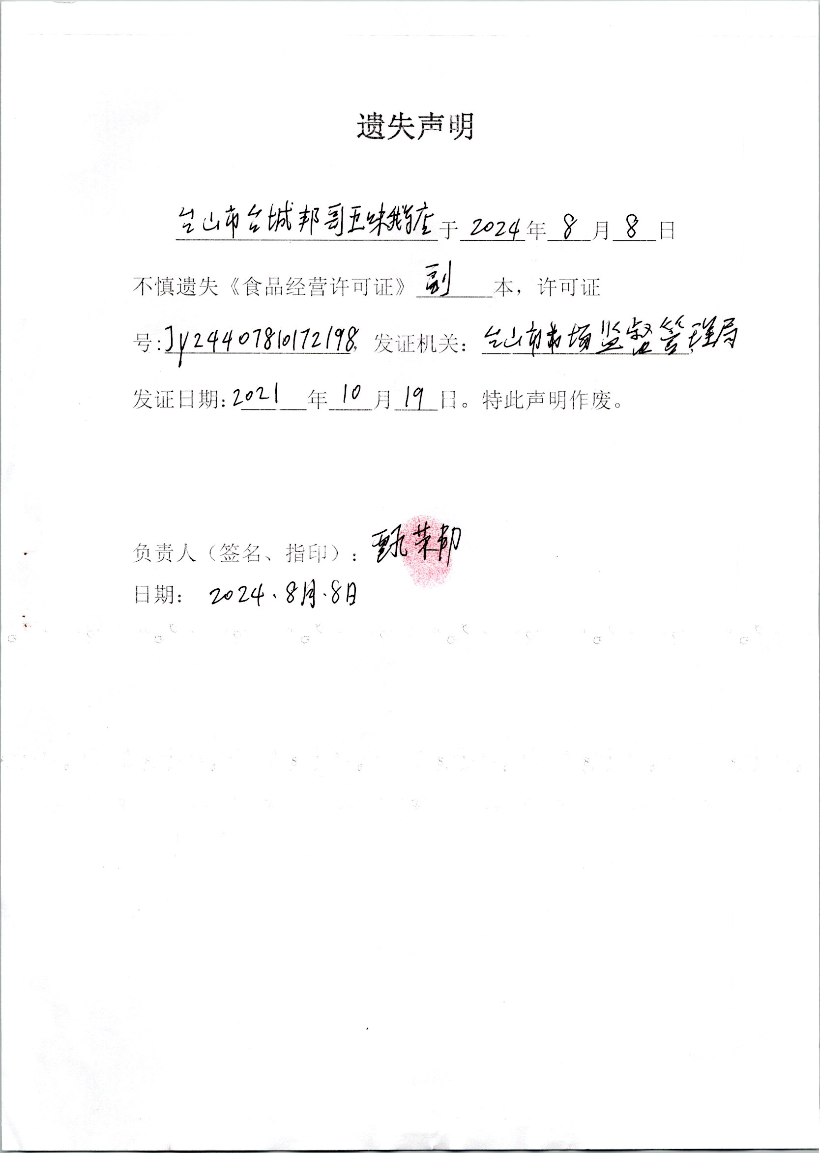 遺失聲明--臺(tái)山市臺(tái)城邦哥五味鵝店