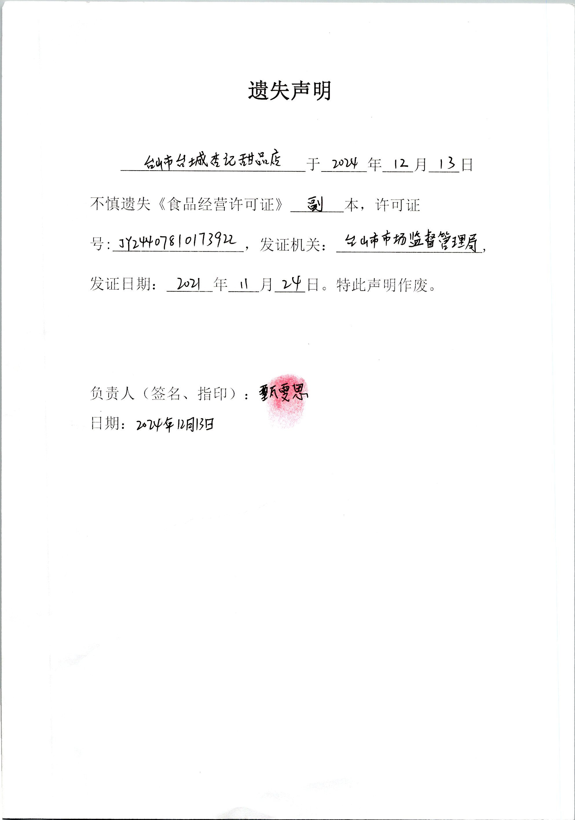 遺失聲明——臺山市臺城杏記甜品店