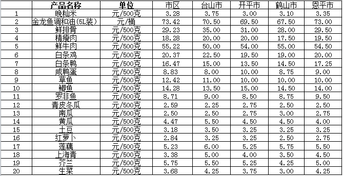 說明:1、表中價格為該地區監測點綜合平均價;2、“市區”含蓬江區、江海區、新會區,價格分別采自蓬江市場、江南市場、城東市場等13家農貿市場;3、其他四個縣市價格分別采自新華市場、錦江市場等8家農貿市場。