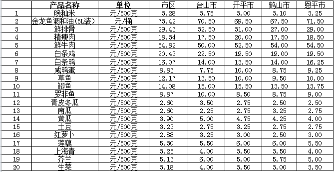 說明:1、表中價格為該地區監測點綜合平均價;2、“市區”含蓬江區、江海區、新會區,價格分別采自蓬江市場、江南市場、城東市場等13家農貿市場;3、其他四個縣市價格分別采自新華市場、錦江市場等8家農貿市場。
