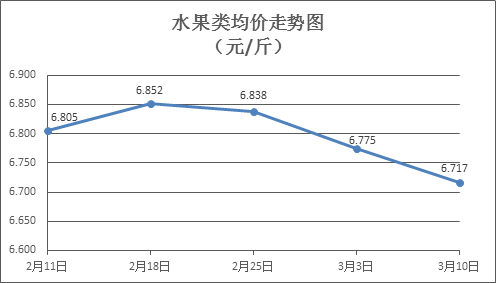 水果類商品價格小幅下降。上周所監測的6種水果商品價格波動情況為5跌1平,綜合零售均價為6.717元/斤,環比下降0.86%。其中橙子、蘋果、葡萄零售均價分別為每斤5.20元、7.43元、15.33元,環比分別下降0.57%、下降1.20%、下降1.10%。