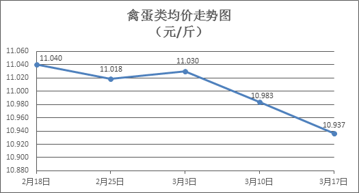 禽蛋類商品價格略有下降。上周所監測的6種禽蛋類商品價格波動情況為5跌1平,綜合零售均價為10.937元/斤,環比下降0.42%。其中:白條雞、白條鴨零售均價分別為每斤20.26元、15.01元,環比分別下降0.15%、下降0.33%;白殼雞蛋、鴨蛋零售均價分別為每斤6.48元、7.66元,環比分別下降1.52%、下降0.39%。