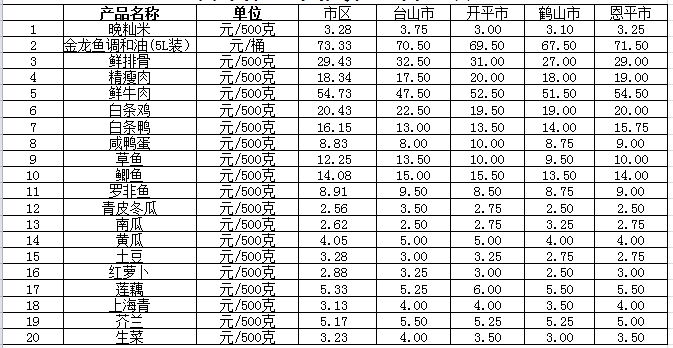 說明:1、表中價格為該地區監測點綜合平均價;2、“市區”含蓬江區、江海區、新會區,價格分別采自蓬江市場、江南市場、城東市場等13家農貿市場;3、其他四個縣市價格分別采自新華市場、錦江市場等8家農貿市場。