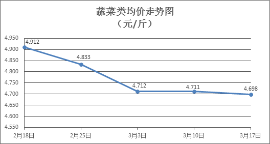 據本市21家農貿市場監測數據顯示,上周(3月11日至3月17日,下同)市場上各類“菜籃子”商品供應充足,所監測的7大類“菜籃子”商品價格1漲5跌1平。其中:糧油類商品價格穩中微降,蔬果類商品價格小幅波動,肉禽蛋類、水產類商品價格總體略降。近期需求降溫,各類農產品價格總體略降,清明節臨近,預計后期需求回暖肉菜類商品價格有所回升。
