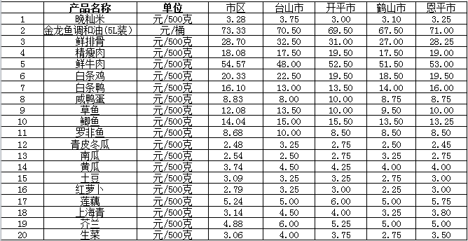 說明:1、表中價格為該地區(qū)監(jiān)測點綜合平均價;2、“市區(qū)”含蓬江區(qū)、江海區(qū)、新會區(qū),價格分別采自蓬江市場、江南市場、城東市場等13家農(nóng)貿(mào)市場;3、其他四個縣市價格分別采自新華市場、錦江市場等8家農(nóng)貿(mào)市場。