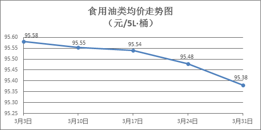 食用油類商品價格微幅下降。所監(jiān)測的9種食用油(5L裝)商品價格波動情況為7跌2平,綜合零售均價為每桶95.38元,環(huán)比下降0.10%。其中:魯花花生油、菜籽油零售均價分別為每桶152.60元、73.50元,環(huán)比分別下降0.03%、下降0.54%。