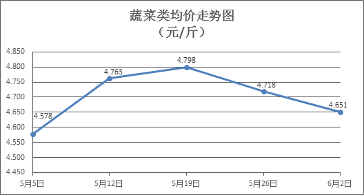 蔬菜類商品價格普遍下降。所監測的32 種蔬菜商品價格波動情況為9漲20跌3平,綜合零售均價為每斤4.651元,環比下降1.42%。其中:漲幅居前的品種包括西紅柿、蓮藕、生姜,零售均價分別為每斤5.04元、5.93元、9.63元,環比分別上漲1.61%、0.85%、0.63%;跌幅靠前的品種包括水空心菜、苦瓜、生菜,零售均價分別為每斤4.17元、4.76元、4.30元,環比分別下降8.95%、8.46%、6.11%。