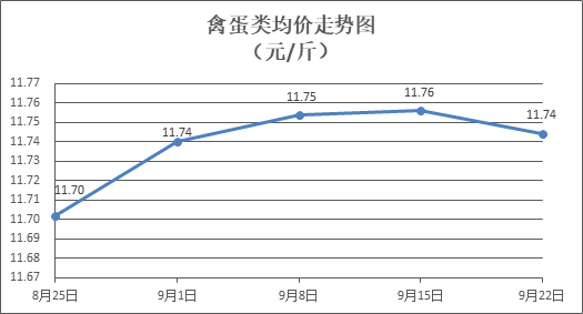 禽蛋類商品價格小幅波動。所監測的5種禽蛋類商品價格波動情況為2漲3跌,綜合零售均價為每斤11.74元,環比下降0.10%。其中:白條雞、白條鴨零售均價分別為每斤20.17元、15.32元,環比分別上漲0.35%、下降0.13%;雞蛋、咸鴨蛋零售均價分別為每斤6.54元、9.06元,環比分別上漲0.31%、下降0.11%。
