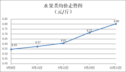 水果類商品價格總體略升。所監測的6種水果商品價格波動情況為4漲2跌,綜合零售均價為每斤6.80元,環比上漲1.32%。其中橙子、蘋果、葡萄零售均價分別為每斤6.95元、7.52元、13.56元,環比分別上漲2.96%、下降0.13%、上漲1.04%。