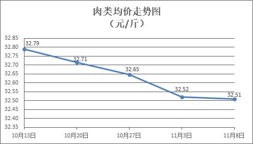 肉類商品價格有所微降。所監測的8種肉類商品價格波動情況為3漲5跌,綜合零售均價為每斤32.51元,環比下降0.04%。其中:排骨、精瘦肉、牛肉、帶骨羊肉零售均價分別為每斤32.26元、20.13元、45.81元、46.69元,環比分別下降0.11%、下降0.17%、下降0.02%、上漲0.27%。