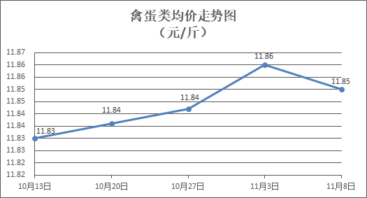 禽蛋類商品價格微幅盤整。所監測的5種禽蛋類商品價格波動情況為3漲2跌,綜合零售均價為每斤11.85元,環比下降0.03%。其中:白條雞、白條鴨零售均價分別為每斤20.46元、15.34元,環比分別上漲0.08%、下降0.11%;雞蛋、鴨蛋零售均價分別為每斤6.58元、7.71元,環比分別上漲0.46%、下降0.66%。