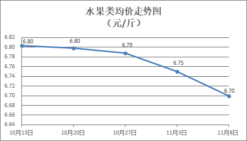 水果類商品價格繼續下降。所監測的6種水果商品價格波動情況為2漲4跌,綜合零售均價為每斤6.70元,環比下降0.70%。其中橙子、蘋果、香蕉零售均價分別為每斤6.42元、7.45元、3.24元,環比分別下降3.79%、上漲0.35%、下降1.07%。