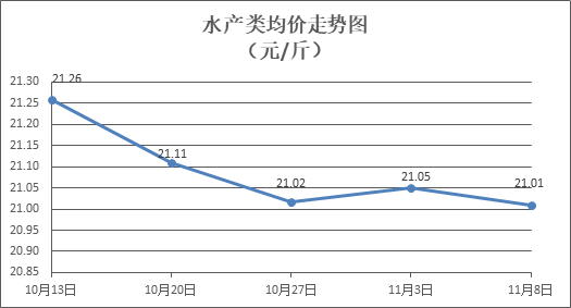 水產類商品價格升降互現。所監測的9種水產商品價格波動情況為5漲4跌,綜合均價為每斤21.01元,環比下降0.16%。其中:草魚、鯽魚、羅非魚、海蝦零售均價分別為每斤11.07元、13.91元、9.04元、49.00元,環比分別上漲0.31%、上漲0.28%、下降0.07%、下降1.21%。