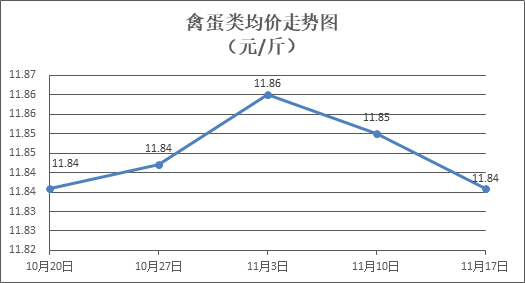 禽蛋類商品價格總體微降。所監測的5種禽蛋類商品價格波動情況為1漲2跌2平,綜合零售均價為每斤11.84元,環比下降0.15%。其中:白條雞、白條鴨零售均價分別為每斤20.38元、15.36元,環比分別下降0.39%、上漲0.13%;雞蛋、鴨蛋零售均價分別為每斤6.55元、7.71元,環比分別下降0.46%、持平。